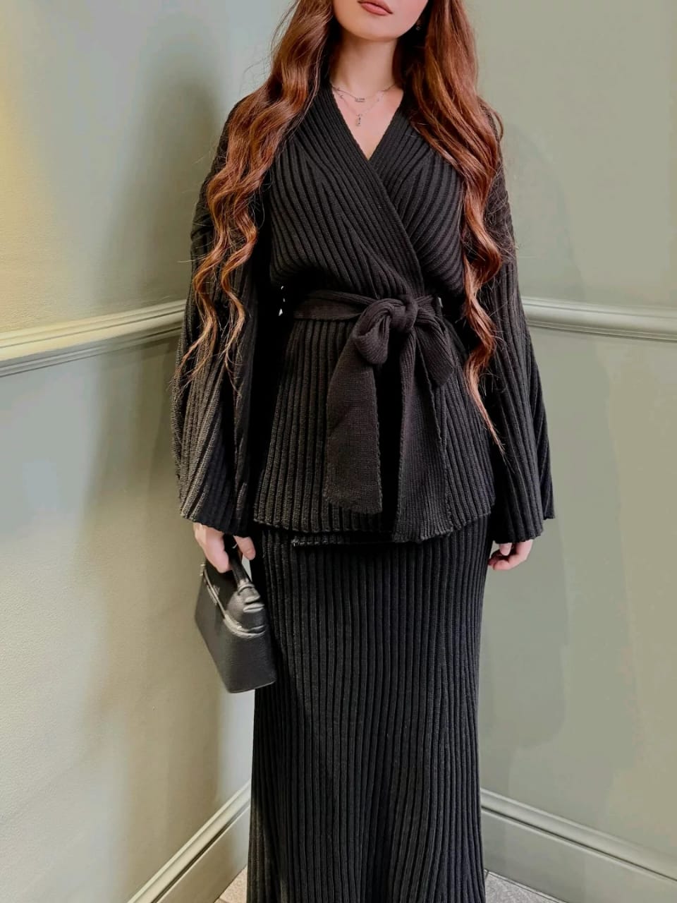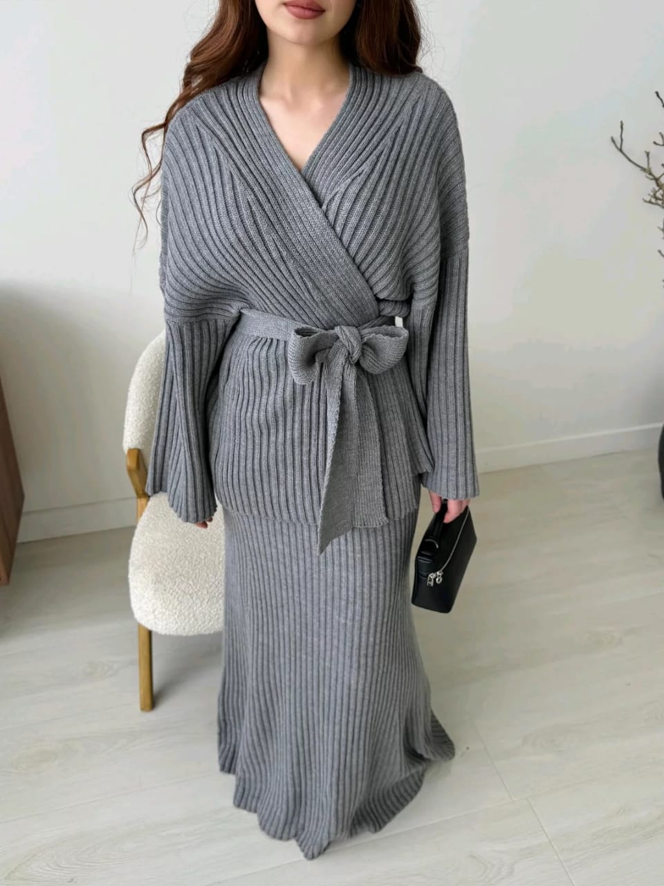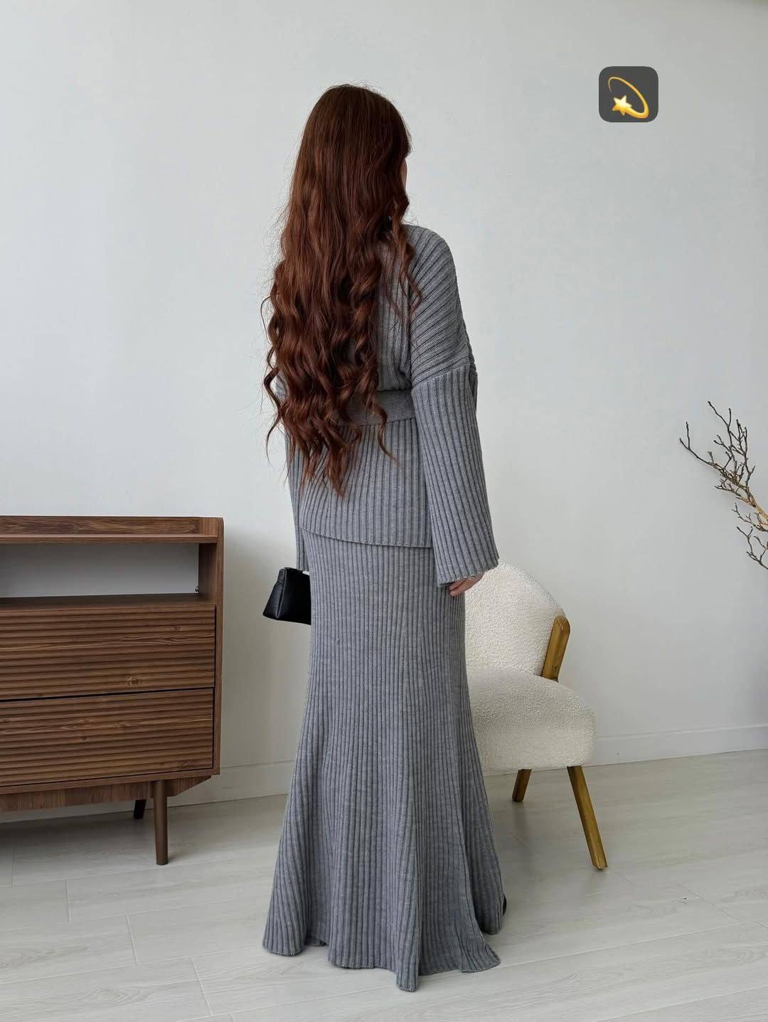 La jupe longue, également en maille côtelée, crée une silhouette harmonieuse, chic et confortable — parfaite pour l’hiver comme pour la mi-saison.