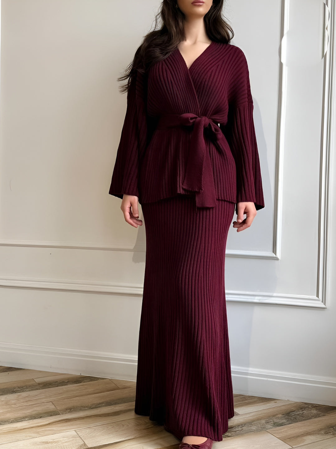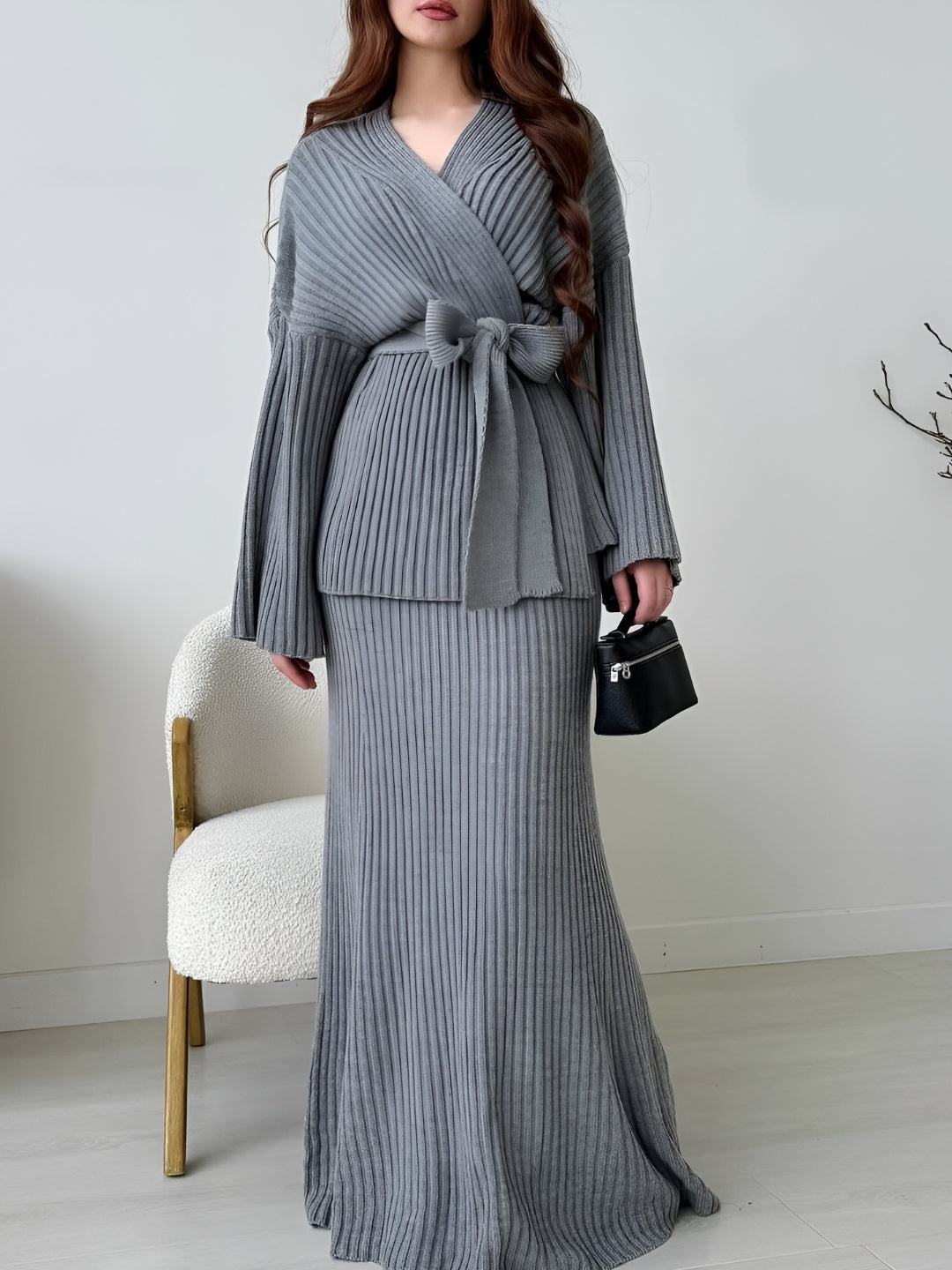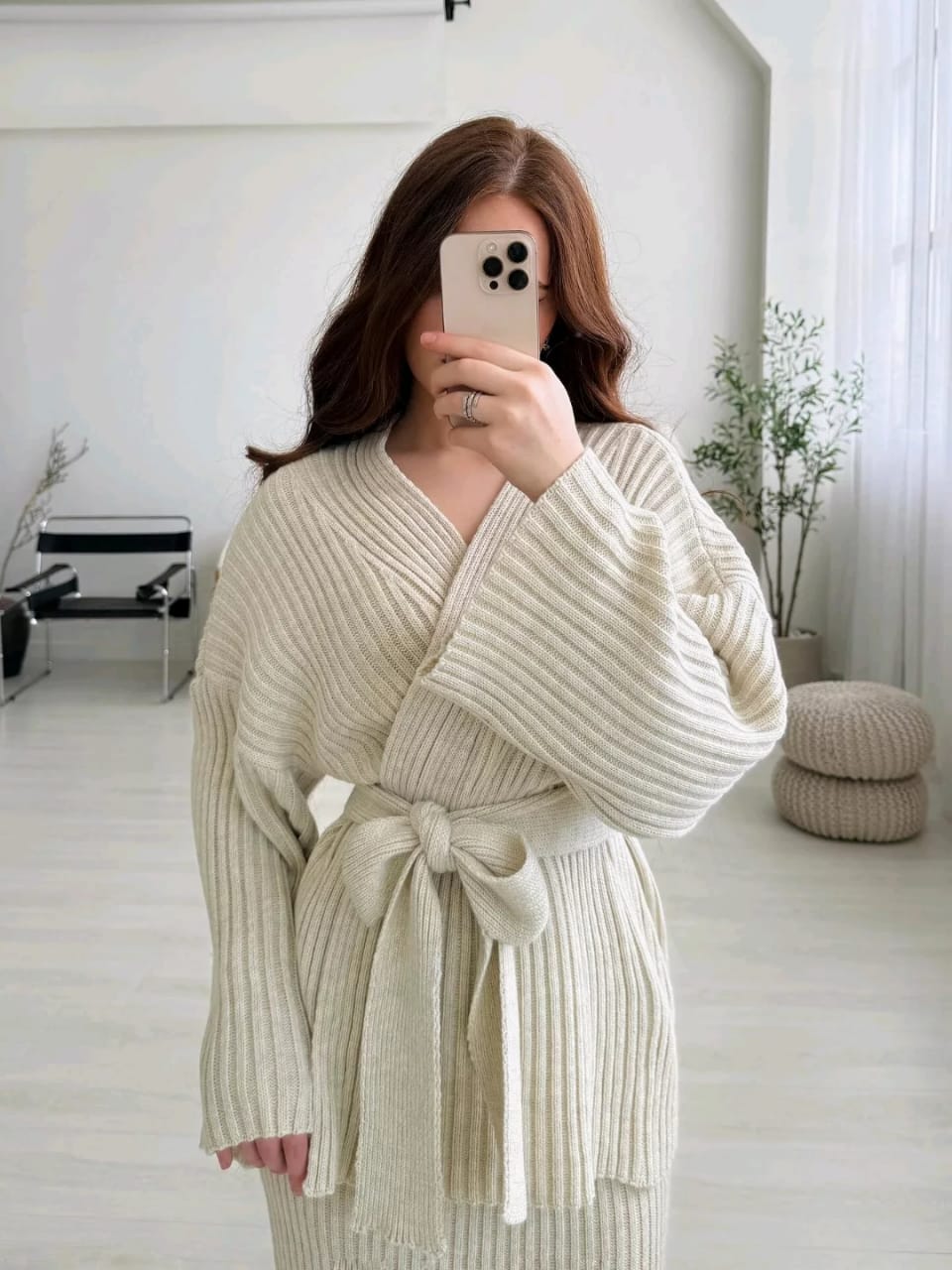 La jupe longue, également en maille côtelée, crée une silhouette harmonieuse, chic et confortable — parfaite pour l’hiver comme pour la mi-saison.